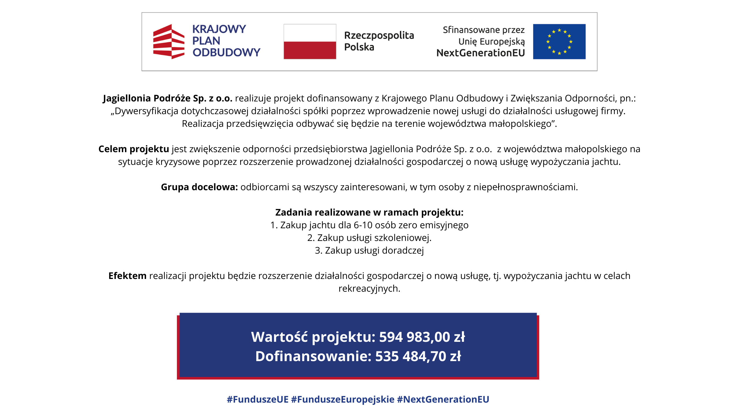 Jagiellonia Sailing to jedna z największych jednostek pływających po polskich wodach śródlądowych, co czyni ją znakomitym wyborem dla rodzin oraz grup znajomych do 10 osób.